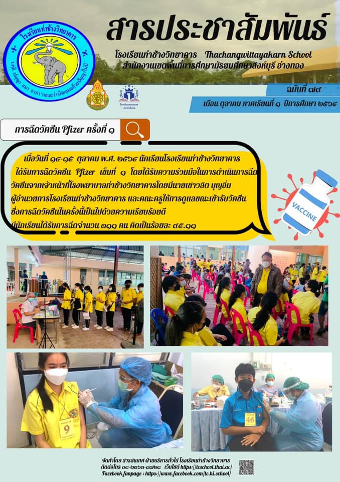 เมื่อวันที่ 14 - 15 ตุลาคม 2564 นักเรียนโรงเรียนท่าช้างวิทยาคาร ได้รับการฉีดวัคซีน ณ โรงพยาบาลท่าช้าง